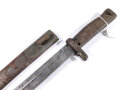 1.Weltkrieg, Ersatzseitengewehr 88/98 Eisengriff, Blechscheide mit Lackresten, auf einer Seite Dellen, Gesamtlänge 45,4 cm, Drücker fest, Spitze der Klinge ca 5mm abgebrochen, Abnahmestempel auf Klinge, Drücker fest