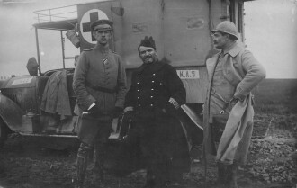 Foto 9 x 14cm Foto um 1916 ( Gasmaske in Tasche am Fahrzeug) Deutscher und französche Soldaten vor Sanitätsfahrzeug