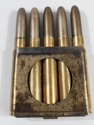 1.Weltkrieg, Laderahmen mit 5 Patronen für Gewehr 88. DEKO, jeweils mit Klingenstück, frei von jeglichen Gefahrstoffen