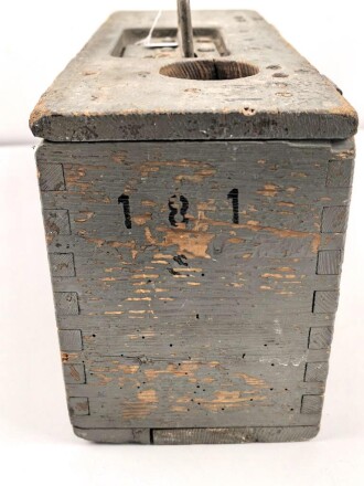 1.Weltkrieg, Transportkasten für 2 Trommelmagazine für MG08 und 08/15. Originallack ?, die Beschriftung sicherlich neuzeitlich, das Loch vor langer Zeit angebracht