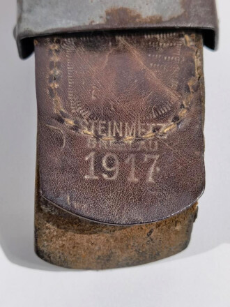 Preußen 1.Weltkrieg, Koppelschloss für Mannschaften aus Eisen, feldgrau lackiert. An Lederlasche von Steinmetz Brenslau 1917