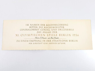 Bestehend aus: - große doppelseitige und farbige Einladung von Dr.Goebbels zum Sommerfest auf die Pfaueninsel. 15.8.1936 - 2 x Teilnehmerkarte zum Sommerfest auf der Pfaueninsel 15.8.1936 dazu ein Zeitungsartikel "Goebbels lud zum Sommerfest" - große doppelseitige Einladung mit Reichsadler zu den olympischen Spielen in Berlin von Goebbels und Göring am 6.8.1936 - großes Foto mit Widmung an Hassler vom Gauleiter Edelmann - Einladung in den Lustgarten am 1.8.1936 von Goebbels und Schirach - Teilnehmerkarte XL. Olympiade Berlin 1936 in der Deutschlandhalle am 16.8.1936. Farbig mit geprägtem Adler - Einladung Mitglieder des Organisations-Komitees für die Olympiade Berlin 1936 - Einladung Eröffnung Autobahn Berlin 17.8.1936 - Einladung durch den Reichssportführer und Frau von Tschammer zum Tee-Empfang 13.März 1937 - Einladung zum Gottesdienst zur Eröffnung der Olyp. Spiele am 1.8.1936 - Einladung durch den Präsidenten des deutschen Olympischen Ausschusses und Frau von Tschammer zum Imbiss am 3.8.19 - 2 x Speisekarten der Stadion Terrasse zum Olyp. Fest - Einladung als Ehrengast zu den Spielen - Einladung von Frau Frick an Frau Hassler zum Tee-Empfang im Garten des Reichspräsidentenpalais am 10.8.1936 - 2 x Teilnehmerkarte Herr/Frau Hassler in die Staatsopfer am 6.8.1936 Alles in einer Mappe beschriftet mit Namen und geprägten Olympia Ringen. Dazu die ganzen Versendungsumschläge.