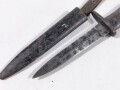 1.Weltkrieg, Grabendolch mit Blechprägegriff von Busch Solingen. Scheide Originallack, Kammerstück mit gereinigter Klinge, Gesamtlänge: 29cm