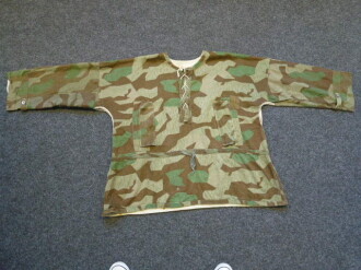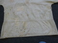 Relativ dickes Drillichmaterial, einseitig bedruckt.Getragenes Stück mit etlichen Reparaturstellen, nach der Reparatur nicht mehr zur Wiederausgabe gelangt. Eindeutiges Belegstück für die Wiederaufbereitung von Uniformstücken bis in die letzten Kriegstage. Sehr seltene Gelegenheit