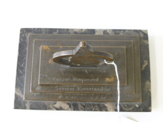 26.Panzerdivision, Erinnerungsgeschenk " Panzer Regiment 26 Seinem Kommandeur 29.9.44 - 3.3.45" Angelaufenes Stück, die Maße des Marmorsockels 8,5 x 13,5cm. Es müsste sich um ein Geschenk an den Eichenlaubträger Johannes Kümmel handeln