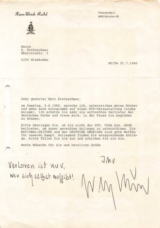 Deutschland nach 1945, Hans-Ulrich Rudel, Schriftverkehr mit 3 eigenhändigen Unterschriften, DIN A4, gebraucht
