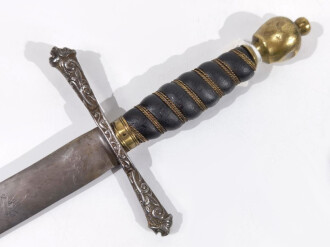 Antiker Linkhanddolch, Alter und Herkunft unbekannt. Klinge und Parierstange zusammengehörig, der Rest dazugebastelt. Gesamtlänge 47cm