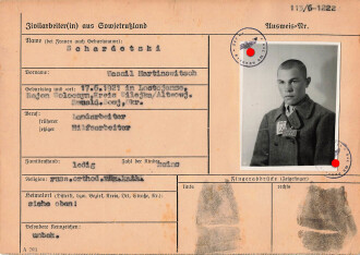 Ausweis eines Zivilarbeiters aus Sowjetrussland. Aufenthaltsort: geflüchtet, 1942