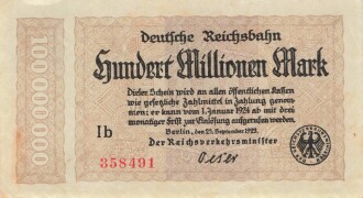 Banknote Deutsche Reichsbahn über Hundert Millionen Mark, datiert 1923