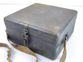 Behälter Vl.K. (Fbg. bf) zur Verlängerungskabeltrommel für das Fernbesprechgerät bf (Vl.K. Fbg.bf) der Wehrmacht. Originallack, datiert 1938, Trageriemen zugehörig