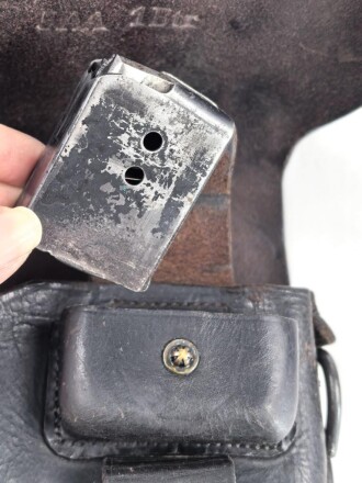 Dänemark, Holster für Bergmann Bayard Modell 1910/21. Dänische Abnahme von 1912. Guter Gesamtzustand, mit zugehörigem Magazin und Putzstock. Im Deckel Deutscher Truppenstempel