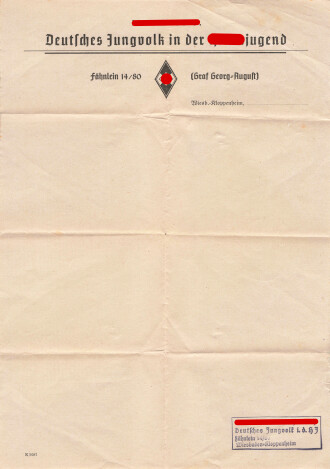 Deutsches Jungvolk in der Hitler Jugend Fähnlein 14/80 Wiebaden Kloppenheim. DIN A4 blanco Vordruck, mehrfach gefaltet