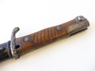Kaiserreich , Seitengewehr Modell 1871, zierliches Eigentumstück mit beidseitig geäzter Klinge, diese einseitig angeschliffen. Oberer Scheidenbeschlag wackelt leicht, ungereinigtes Stück