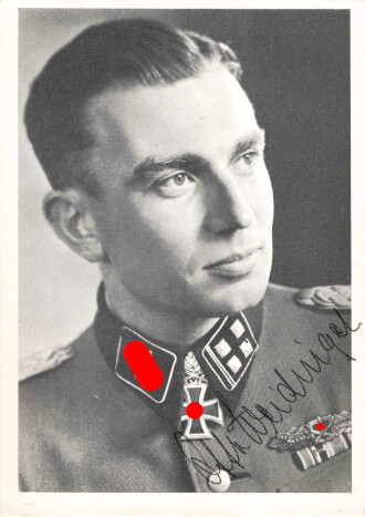 Deutschland nach 1945, SS-Obersturmbannführer Otto Weidinger (SS-Panzergrenadier-Regiment 4 "Der Führer"), eigenhändige Unterschrift auf Repro-Foto, 24.7.1980, ca. 10 x 14,5 cm, guter Zustand