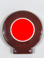 Fahrrademblem schwarzlackiertes Hakenkreuz auf weiß in rotbraunem Preßstoffrahmen. Ungebrauchtes Stück, bei einem der HK ca. 15% Farbverlust. Höhe insgesamt 80mm