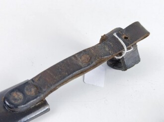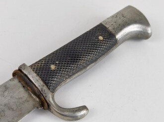 Fahrtenmesser für Angehörige der Hitlerjugend. Hersteller Wilhelm Halbach Solingen. Motto verputzt, Emblem wackelt leicht, Scheide alt überlackiert. Ungereinigtes Stück