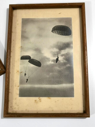 Fallschirmjäger, drei original gerahmte Kauffotos, Maße der Rahmen jeweils 22,5 x 32cm . Ungereinigt