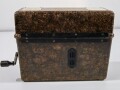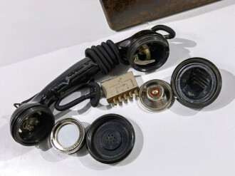 Feldfernsprecher 33 der Wehrmacht datiert 1940. Die Metallbeschläge neuzeitlich lackiert, Kabel neuzeitlich, Funktion nicht geprüft