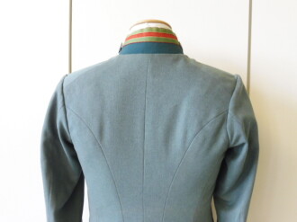 Feldgrauer Waffenrock für einen Jäger zu Pferd , Eigentumstück mit diversen kleinen Mottenlöchern, angeschmutzt. An den Ärmelaufschlägen und am Kragen ist neben der originalen auch eine scheinbar neuzeitlichere ( grüne ) Naht zu sehen