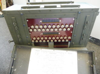Feldklappenschrank zu 20 Leitungen der Wehrmacht, Baujahr 1943. Überlackiertes Stück, Funktion nicht geprüft. Versand vermutlich teurer als angegeben.