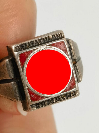 Fingerring " Deutschland Erwache" mittig schwarz emailliertes Hakenkreuz auf weissem Grund. getragenes Stück, die Emaille stumpf und rissig