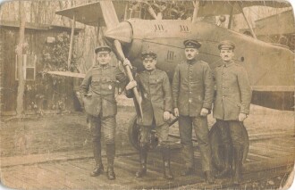 Foto Deutsche Soldaten der Fliegerabteilung "A 282" (Artillerie) vor einem Flugzeug/Doppeldecker, einer davon mit Kaiserabzeichen, 9 x14 cm