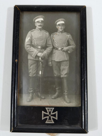 Foto zweier preußischer Ulanen in patriotischem Bilderrahmen mit Eisernem Kreuz. Höhe 17,5cm