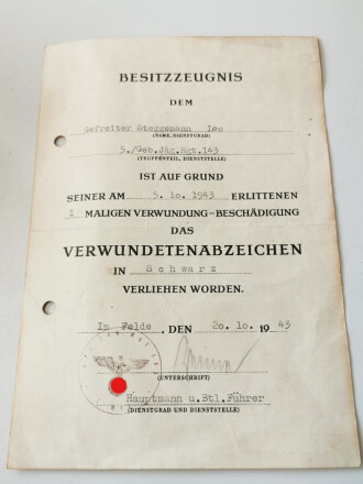 Gebirgsjäger Regiment 143, Verleihungsurkunde zum Lapplandschild sowie des Verwundetenabzeichen schwarz, Erinnerungsgegenstand mit wohl selbstgemachtem Lapplandschild und seinen Auszeichnungen sowie eingesticktes Edelweiss.