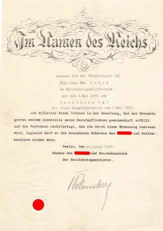 Generalfeldmarschall von Blomberg, eigenhändige Unterschrift als Reichskriegsminister auf Ernennungsurkunde vom 20.April 1936