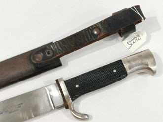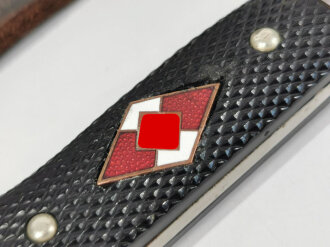 HJ Fahrtenmesser, Frühes Stück mit Devise von Gottlieb Hammesfahr Solingen. An sich ein ordentliches Stück, leider wurde das Griffemblem neuzeitlich ergänzt, dazu wurde der bereich aufgefräst und das Emblem eingeklebt.