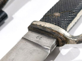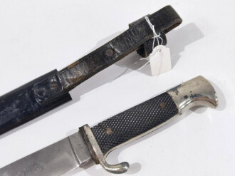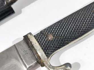 Hitler Jugend Fahrtenmesser. Doppelhersteller Eickhorn M7/66, Emblem wackelt leicht. Scheide überlackiert, Lederschlaufe mit Druckknopf unsachgemäß ergänzt