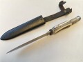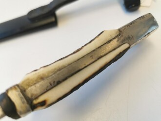 Hitler Jugend Fahrtenmesser, Doppelhersteller RZM M7/7 Herm.Kone Jung A.G Solingen. Die Griffschalen entfernt und durch Hirschhorn ersetzt, die Scheide alt überlackiert., Verschlussriemen defekt