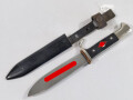 Hitler Jugend Fahrtenmesser, Hersteller Anton Wingen Solingen. Emblem wackelt leicht, Scheide Originallack, Devise deutlich. Ordentliches Stück, ungereinigt