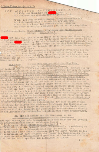 KPD Flugblatt "Offene Krise in der SPD", Bezirksleitung der KPD Wasserkante, ca. DIN A4, gelocht, mehrfach gefaltet, leicht verschlissen