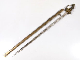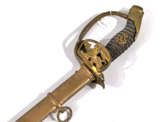 Kaiserreich, Preußen, Infanterie- Offiziersdegen Modell 1889 mit Klappkorb, vernickelte Klinge leicht angeschliffen, Scheide goldfarben überlackiert, Messingteile des Griffes mit Vergoldungsresten, ungereinigt