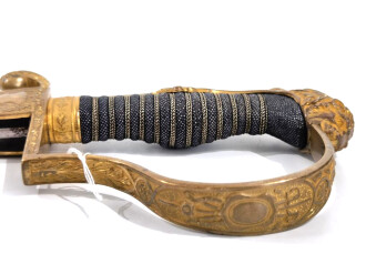 Kaiserreich Preußen, Parderkopfsäbel für Artillerieoffiziere und Wachtmeister mit vernickelter und doppelt geätzter Stahlklinge, vergoldetes Gefäß mit intakter Rochenhaut und Drahtwicklung. Scheide Originallack . Relativ wuchtige Ausführung