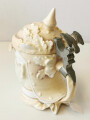 Kaiserreich, dekorativer Bierkrug aus Porzellan Otto von Bismark Darstellend. Leichte Beschädigung am Vorderschirm und der Spitze, sonst guter Zustand. Gesamthöhe 19cm