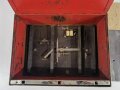Kasse für Zahlmeister der Wehrmacht. Datiert 1940, ungereinigtes Stück. Im Boden war wohl eine Art Klingel installiert, die beim hochheben losgegangen wäre. Verschluss defekt, kein Schlüssel
