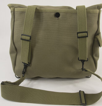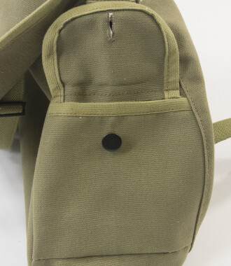Manufactured reproduction of the M1936 Musette Bag issued to troops during WWII. It can be worn as a pack, attached to the M1936 Combat Suspenders, or as a bag by using the detachable shoulder strap. Although general issue, these are most often associated with US Army Paratroopers who used these as backpacks due to the impracticality of the M1928 Haversack for airborne operations. The musette bag has a small, 5" x 5" (12,7cm x 12,7cm) external side pocket, and a larger, 10" x 12" (25cm x 30cm) rear pocket, both closed with tack buttons. The main compartment is approximately 11" x 12" x 5" (28cm x 30cm x 12,7cm), and this has an internal divider that itself is divided in two, giving 4 actual compartments inside.The Musette Bags are made just like the originals, using no. 8 100% cotton duck canvas, in the WWII issue olive drab number 3 shade. The straps are 100% cotton, shuttle loomed webbing of the appropriate sizes and types, and all hardware is military spec. The tack buttons, riveted slides, and D-rings are NOS original WWII. The snaps hook, ball tips, GP strap hardware and 1" (2,5cm) slides are Scovil. (They were a WWII era contractor.) The markings are professionally stenciled and heat cured. All bags include the 2" (5cm) wide General Purpose carrying strap.Made in USA manufactured by ATF
