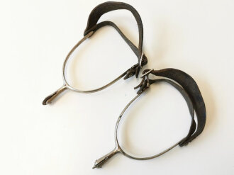 Brille Wehrmacht, identisch zur Kradmelderbrille, allerdings statt dem Gummi- ein Lederwulst. Datiert 1943, das Zugband nicht mehr elastisch