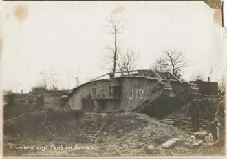 Aufnahme eines liegengebliebenen englischen Panzers/Tank, Bullecourt/Frankreich 1917, 9 x 14 cm