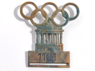 Olympische Spiele 1936 Berlin " Offizielles Teilnehmerabzeichen für einen Sportler " Abzeichen mit Teilnehmernummer 1101, Rückseitig mit Hersteller L.Chr.Lauer Nürnberg- Berlin, Nadelsystem defekt.