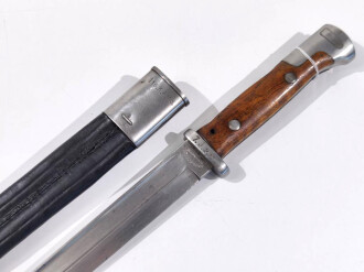 Preussen, Kaiserreich, Seitengewehr Modell 1871/84, Lederscheide, mit kurzer Hohlbahn, aptiert ohne Laufring, mit Abnahmestempel auf Klingenrücken W 87 und Abnahme auf Griffstück sowie Scheidenmund - und Ortblech
