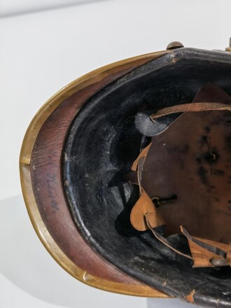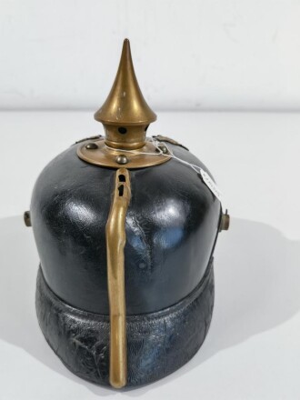Preussen, Pickelhaube für Mannschaften. Kammerstück des Infanterie Regiment 82 von 1913. Der Korpus im hinteren Bereich repariert, bei der gelegenheit Teller und Hinterschiene unsachgemäß wieder angebracht