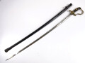 Säbel für Offiziere des Heeres mit vernickelter Stahlklinge, Messinggefäß, Kunststoffgriffschalen mit intakter Drahtwicklung, Scheide mit Rostspuren.