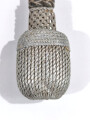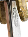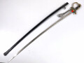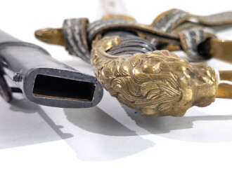 Säbel für Offiziere des Heeres, vernickelte Stahlklinge, Messinggefäß vergoldet, Löwenkopf mit roten Glasaugen, Kunststoffgriffschalen mit intakter Drahtwicklung, Hersteller Höller Solingen, Scheide Originallack aber beilackiert, anhängende Troddel