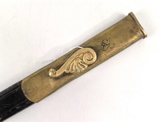 Scheide für einen Offiziersdegen, Gesamtlänge 82,5 cm, Mundblechöffnung für 23 mm Klingenbreite, 4 mm Klingenstärke, Messingbeschläge mit Vergoldungsresten auf Munddblech