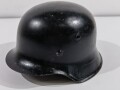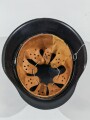 Stahlhelm Modell 1942 mit originalem Innenfutter, Zugband und Nieten. Schwarz überlackierte "ckl64" Glocke