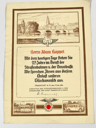 Urkunde der Direktion der Strassenbahnen und Omnibusse der Stadt Frankfurt am main anlässlich eines 25 jährigen Dienstjubiläums 1934. Maße 25 x 35cm