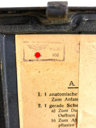 Verbandkasten Wehrmacht, Originallack, guter Zustand. das usprüngliche Inhaltsverzeichnis wohl gegen Ende des Krieges mit einer abgespeckten " Packordnung des Verbandkastens für KZ" überklebt
